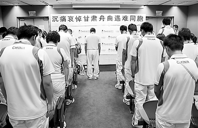 8月15日,参加青奥会的中国体育代表团在默哀。当日,在新加坡参加首届青奥会的中国体育代表团,在驻地青奥村举行哀悼活动,向甘肃舟曲特大山洪泥石流遇难同胞表示深切哀悼。 新华社记者 凡军 摄
