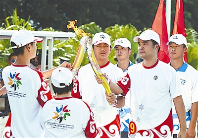 8月16日,两名火炬手在传递中交接。当日,第五届全国特奥运动会火炬开始在福建省福州市进行首站传递。9月19日至25日,第五届全国特奥运动会将在福州举行。