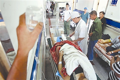 8月17日,黑龙江伊春,乌马河区华利实业有限公司(鞭炮厂)爆炸伤者被送往医院救治。8月16日上午9时40分许,黑龙江省伊春市乌马河区华利实业有限公司(鞭炮厂)发生持续爆炸,附近5公里有强烈震感。国家安监总局17日通报称,初步认定企业为非法生产。小刚 摄