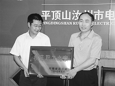 8月11日,河南省汝州市副市长韩自敬,受河南省总工会、平顶山市总工会的委托,向汝州电业公司工会授予省级“模范职工之家”称号,电业局党政工领导参加授牌仪式 。图为韩自敬(右)为电业公司党委书记窦君逢授牌。
