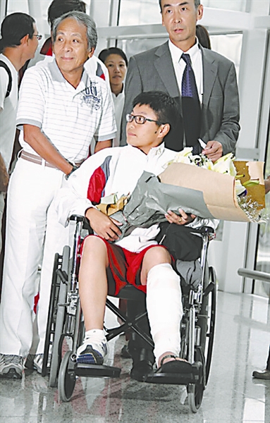 8月17日,在委内瑞拉女子棒球世界杯比赛中被流弹击中的中国香港运动员卓菀尔返回香港。图为中国香港女子棒球选手卓菀尔(前)抵达香港国际机场。新华社发 李秋婵 摄