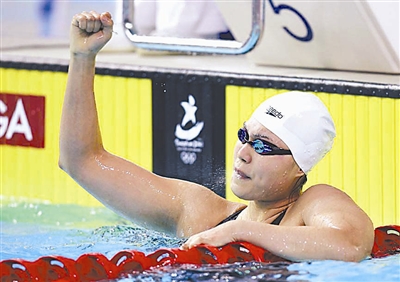 8月17日,在第一届青少年奥林匹克运动会女子100米自由泳决赛中,唐奕以54秒46的成绩夺冠。图为中国选手唐奕比赛结束后庆祝胜利。 新华社记者 凡军 摄