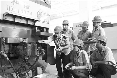 8月18日,大秦铁路湖东电力机务段职工、全国劳模程利甫(前左一)在机务段维修车间现场培训新参加工作的大学生。湖东电力机务段是大秦线重要的牵引动力单位,近年来非常注重职工队伍的建设。全段8200人中,拥有高级技师12名,技师283名,高级工4199名,高级技术人才133名。新华社记者 张燕辉 摄