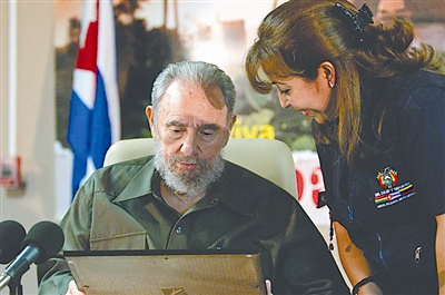 8月17日,在古巴首都哈瓦那何塞·马蒂国际机场,古巴革命领导人菲德尔·卡斯特罗与“莫托·门德斯”医疗支持队队长奥达莉斯·布拉沃交谈。