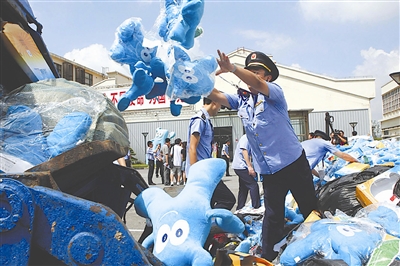 8月22日,上海世博会事务协调局集中销毁假冒“世博特许”商品,近期收缴的10万多件假冒世博会特许商品被装进垃圾车,送往指定地点进行焚烧。 汤彦俊 摄