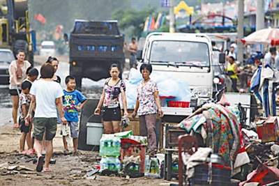 8月22日,宽甸满族自治县古楼子镇洪灾严重,群众将受灾房屋内的物品堆放在公路两侧。