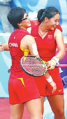 8月21日,郑赛赛(左)与唐好辰赛后拥抱庆贺。当日,在新加坡举行的首届青奥会女子网球双打比赛中,中国组合郑赛赛/唐好辰以2比1战胜斯洛伐克组合切佩洛娃/斯卡姆洛娃,夺得冠军。
