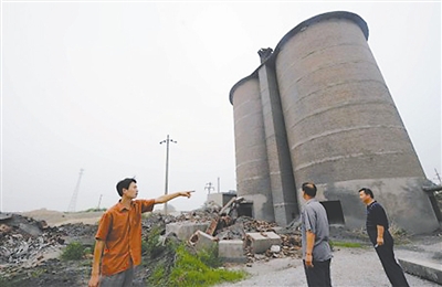 福益熟料厂近40米高的机立窑已被拆除,原料仓(图右侧)近日也要拆除,落后的机立窑时代将过去。郑荣玺 摄