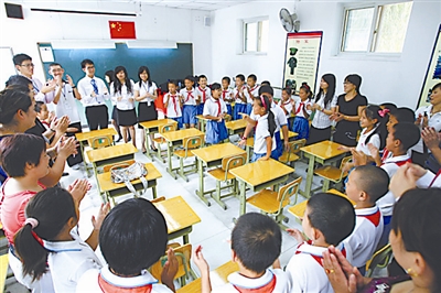 8月24日,北京朝阳区将台洼小学,50名来自香港的中学生和该校小学生一起做游戏。成立于1999年的将台洼小学现有学生365人,其中98%为进城务工人员子弟。本报记者 杨登峰 摄
