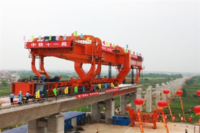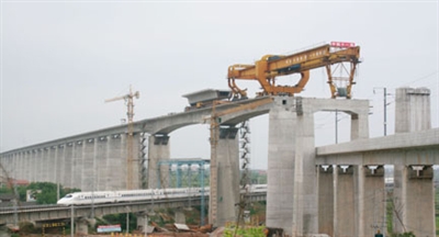 2009年6月16日,石武客专第一榀900吨箱梁,在中铁十一局集团项目部管段凌空飞架。
