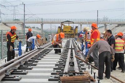 经过两年时间的艰苦奋战,石武客专已进入最后冲刺阶段。图为中铁十一局职工正在进行无砟轨道铺设施工。