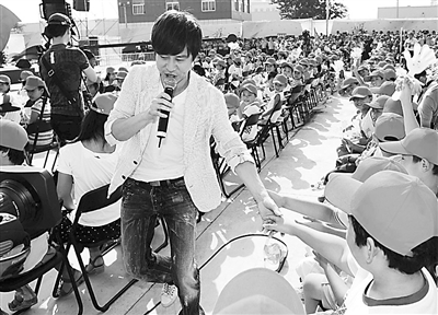 8月25日下午,中华全国青年联合会第十一届委员会全体会议组织与会青年委员前往北京新发地农产品批发市场,与在此务工的农民工及其子女们进行联欢。图为青联委员、著名歌手解晓东走到孩子们中间演唱歌曲。侯宇 摄