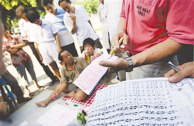 8月26日,海口市府城街头,海南私彩市场,一些市民在“研究”彩票号码。