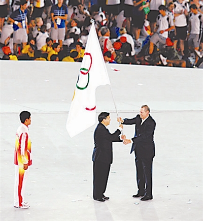8月26日,第一届青少年奥林匹克运动会在新加坡闭幕。图为在闭幕式上国际奥委会主席罗格(右)将奥林匹克会旗交给下届青奥会主办城市南京市市长季建业手中。新华社记者 宋振平 摄