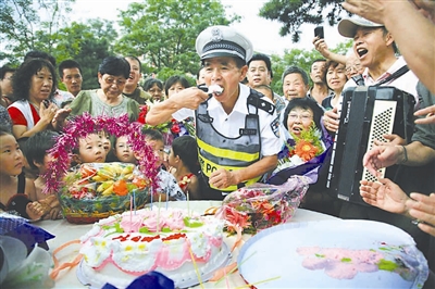 8月27日是交警李栓良60岁的生日,也是他退休的日子。沈阳千名市民自发来到泰山路交通岗给这位有着“全国公安系统二级英模、全国劳动模范”等多项荣誉称号的老交警过生日。李栓良退休后,泰山岗也将以他的名字命名为“李栓良岗”。黄金崑 摄