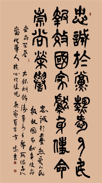 展览汇集了130余幅书画作品,很多著名书法家也挥毫泼墨,妙手丹青。如《中国》、《汶川印象》、《危难之中显身手》、《长城》、《军魂》、《党指挥枪》等作品表达他们对当代革命军人核心价值观的拥护及对人民军队的热爱。(源源)