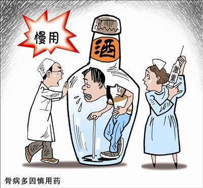 长时间使用激素,最短能在使用几个星期之后就会引起股骨头坏死。在望京医院接收的病例中,喝酒引起股骨头坏死的,最短的也得四五年,有些喝完十年八年才会得。现在初步分析的结果显示,喝酒的人得股骨头坏死的发病特征是:1.酒龄比较长;2.以白酒为主,但也见到过喝啤酒得股骨头坏死的病例;3.基本上天天喝。哪怕一次喝大酒喝醉了,但是十天半个月才喝一次,那也没关系;但如果天天喝四两半斤,就会有问题。医院曾接收过喝啤酒得股骨头坏死的病例,这个人白酒一滴不沾,但是每天至少喝三瓶啤酒,喝了近十年。