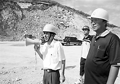 图为谭扬亮(左)住院前一天在一家石场主持昌江黎族自治县中心孔爆破推广现场会。