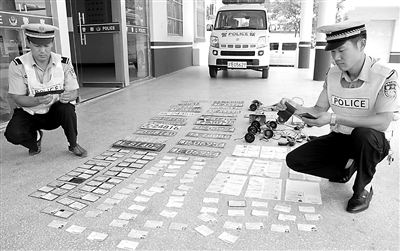 日前,河南省滑县公安局交巡警对缴获的机动车假牌、假证和警报器等进行登记造册。