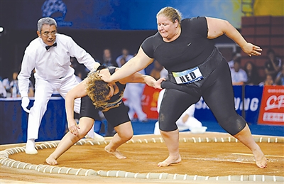 8月29日下午,北京首届世界武搏运动会相扑比赛在中国农业大学体育馆进行。女子无差级别比赛不限体重,来自俄罗斯的女选手沃洛布耶娃(图左)面对体重比自己大许多的荷兰选手哈特维尔德毫不畏惧,顽强地与对手周旋。本报记者 许之丰 摄