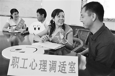 8月30日,安徽淮北矿业朱庄煤矿几名协安员正在与职工进行谈心。该矿工会设立职工心理调适室,组织专门人员与情绪不稳定、心理波动大的职工开展交流谈心活动,帮助其调适身心,以良好的状态投入工作,从而消除不安全因素,确保安全生产。韩荣 摄