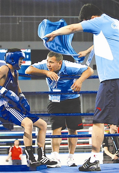 8月30日,2010年北京首届世界武搏运动会拳击比赛的四分之一决赛在北京奥体中心体育馆开打。图为在比赛休息时间,教练员为比赛选手扇风降温。