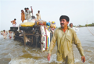巴基斯坦洪灾仍未缓解,虽然暴雨有所减弱,但南部信德省仍有多处水坝决堤,淹没大片村庄和田地。过去两天,又有约100万灾民逃离家园。图为逃难的灾民被困在洪水中。阿健 供图