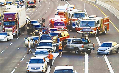 28日晚,美国亚利桑那州凤凰城突遭特大暴雨袭击,造成10号州际公路同时发生三起交通事故,导致69辆汽车追尾堵在公路上。图为其中一处交通事故现场。吉平 供图