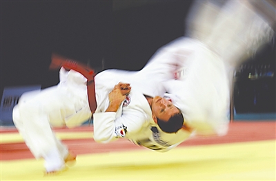 北京首届世界武搏运动会柔术比赛8月30日晚在北京科技大学体育馆举行,柔术比赛云集了武术的推、拿、格、斗、摔等多种攻击战术手段。特别是双人演武,进攻速度之快让观众眼花缭乱。图为柔术男子双人一对奥地利选手在进行表演。 本报记者 许之丰 摄