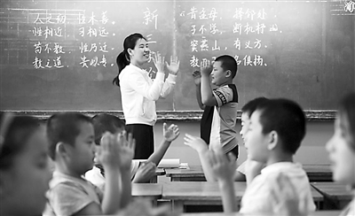 哈尔滨海城小学老师在新三字经课堂上与学生们互动。(8月31日摄)。