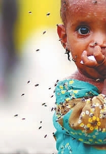 巴基斯坦遭遇洪灾后,最令人心痛的是满脸惊恐的儿童。糟糕的医疗条件和霍乱、疟疾随时都可能夺走他们脆弱的生命。图为:一群苍蝇围着一个生病的小女孩乱转。(罗科 供图)