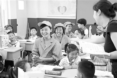 9月7日,合肥市奥林小学二年级教室内,12名农民环卫工与小学生们一起听老师讲课。当日,合肥市蜀山区清洁二队开展进城务工人员扫盲培训活动。 沙先清 黄河 摄