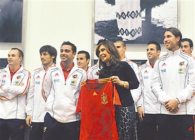 9月6日,阿根廷总统克里斯蒂娜(右)在布宜诺斯艾利斯的总统府会见西班牙国家足球队时,展示西班牙国家足球队赠送的一件有所有队员签名的球衣。