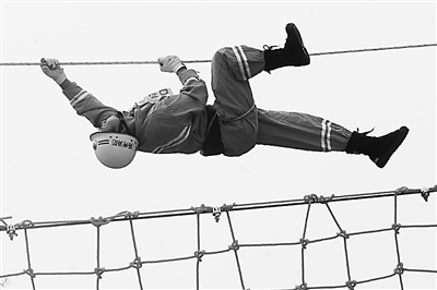 10月10日,一名消防队员在高空山岳救助操比赛中攀爬。