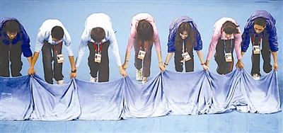 10月10日,工作人员用浴巾擦拭比赛场地。当日,2010中国网球公开赛男单决赛因天气原因,一拖再拖。原本下午4点开赛的单打决赛拖到晚8点多才开赛。比赛开始后,又因为下雨而中断。男单决赛对阵双方为塞尔维亚选手焦科维奇和西班牙选手费雷尔。新华社记者 陈建力 摄