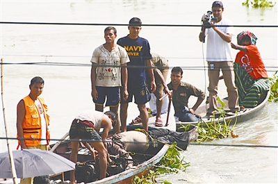 10月11日,救援人员在孟加拉国首都达卡郊外萨瓦尔镇的客车坠河事故现场打捞起一具遇难者尸体。