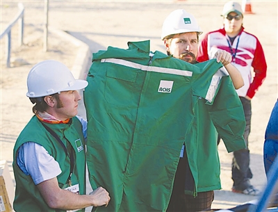 10月11日,在智利科皮亚波的圣何塞铜矿,救援人员展示为被困矿工特制的防护服。