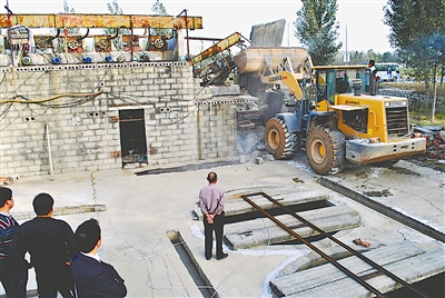 10月12日,铲车正在拆除地瓜淀粉加工设备。连日来,枣庄市山亭区店子镇组织公安、工商、国土、供电、环保等部门对镇内地瓜淀粉加工、土小企业等一批污染环境、损害民生的加工厂进行现场拆除取缔。孙成生 摄