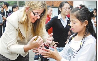 10月11日,在江西九江市博爱聋校,来自美国马萨诸塞州聋人学术中心的聋哑老师与中国的聋哑学生一起做“翻格子”游戏。当日,美国聋人学习中心和该校结为姊妹学校。据了解,这也是目前中美特殊教育学校首次缔结的姊妹学校。 胡国林 摄