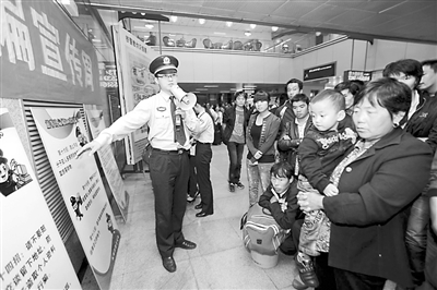 日前,杭州铁路公安处的民警在杭州火车站向旅客讲解如何鉴别火车票真伪。为提高旅客防诈骗意识,该处民警开展为期一周的防诈骗宣传活动,通过宣传板讲解、发放宣传单等方式为旅客讲解如何辨别车票真伪,保障出行利益。 叶飞 摄
