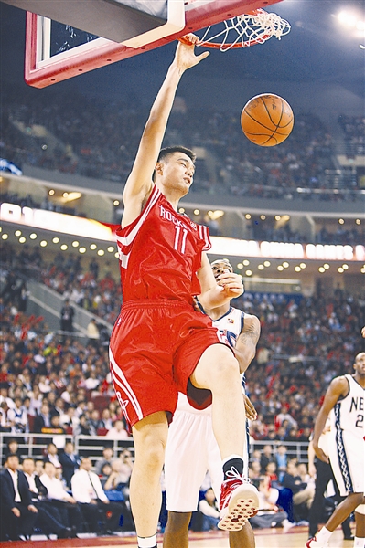 10月13日,姚明单手扣篮得分。当日,NBA中国赛第一场比赛在北京五棵松体育馆举行,休斯敦火箭队迎战新泽西网队。