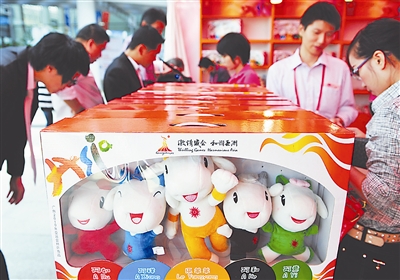 10月17日,一位买家买走10套亚运吉祥物玩偶。在正在进行的广交会上,广州亚运会特许商品专卖店吸引了很多人驻足观看,各种亚运商品受到买家的热捧。据介绍,广交会举行两天以来,这家专卖店每天的营业额都达3万元人民币左右。新华社记者 梁旭 摄