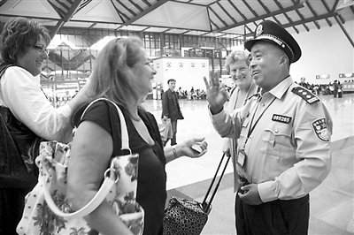 图为上海火车站民警正在用英语耐心回答外籍旅客的问询。林荣贵 摄