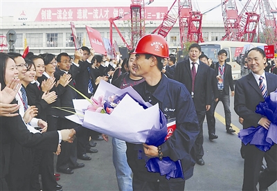10月19日,经过20多天的日夜坚守,参与智利矿难救援的中国三一集团工程师郝恒(中)回到中国上海,并受到公司同事的热烈欢迎。中国工程机械设备与中国技术人员积极参与智利矿难救援,受到了智利政府和人民的肯定和感谢。 肖前辉 摄