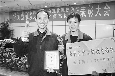 10月19日,安徽淮北矿业集团岱河煤矿的何皖明与儿子何海涛手捧着奖杯笑逐颜开。在该矿刚刚结束的“名师高徒”大赛中,二人荣获本专业组第一名,获奖励2000元。当日,“何皖明班”被评为优秀班组,何皖明也被评为优秀班组长,这对父子成为最令人羡慕的一对“明星”。据了解,开设“名师高徒”大赛,是该集团为提高青工队伍综合素质所采取的措施之一。黄世鹏 摄