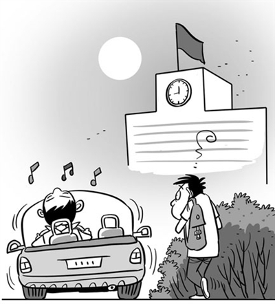 一边是生活拮据的贫困大学生,一边是快乐的“有车族”,这无疑会刺痛一些人的神经。当贫富差距拉大已成为一种现实时,我们也许没有太好的办法“严禁”这种差距出现在校园中,但对学生的价值观的引导是不可少的。