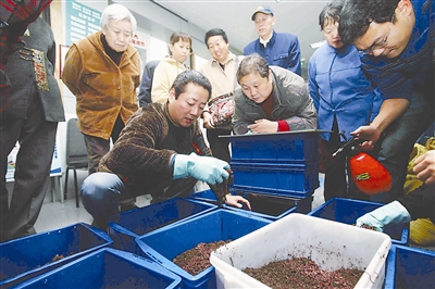 10月19日上午,北京东城区东四七条社区活动室内,工作人员正在给居民讲解养殖蚯蚓分解垃圾的注意事项。时隔一年半,蚯蚓吃垃圾再进社区推广,希望通过蚯蚓分解厨余垃圾,以生态的方式解决垃圾难题,蚯蚓有望成为居民家中消灭厨余垃圾的“中坚力量”。 潘之望 摄