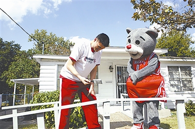 10月19日,火箭队队员姚明顶着烈日在“监工”火箭熊的注视下为楼梯扶手刷油漆。当日,休斯敦火箭队在当地一个贫困社区为一名叫哈迪的老妇人维修并油漆房屋,将破旧的房屋整修一新。新华社发 (宋穹摄)