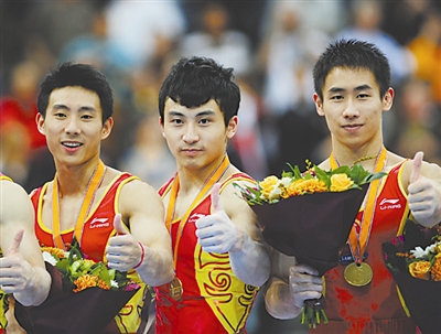 10月21日,中国队队员滕海滨、冯喆和严明勇(从左到右)在颁奖仪式上。当日,在荷兰鹿特丹举行的第42届世界体操锦标赛男子团体决赛中,中国队以274.997分的总成绩夺得冠军。新华社发