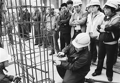 10月21日,一线建筑行业农民工选手参加钢筋加工安装项目比赛。当日,2010年西安中天五建建筑技能大赛在西安城市理想项目施工工地举行,来自59个项目部的300名农民工选手分成6组,参加钢筋加工安装、木工支模等项目比赛,角逐全部6个项目桂冠。